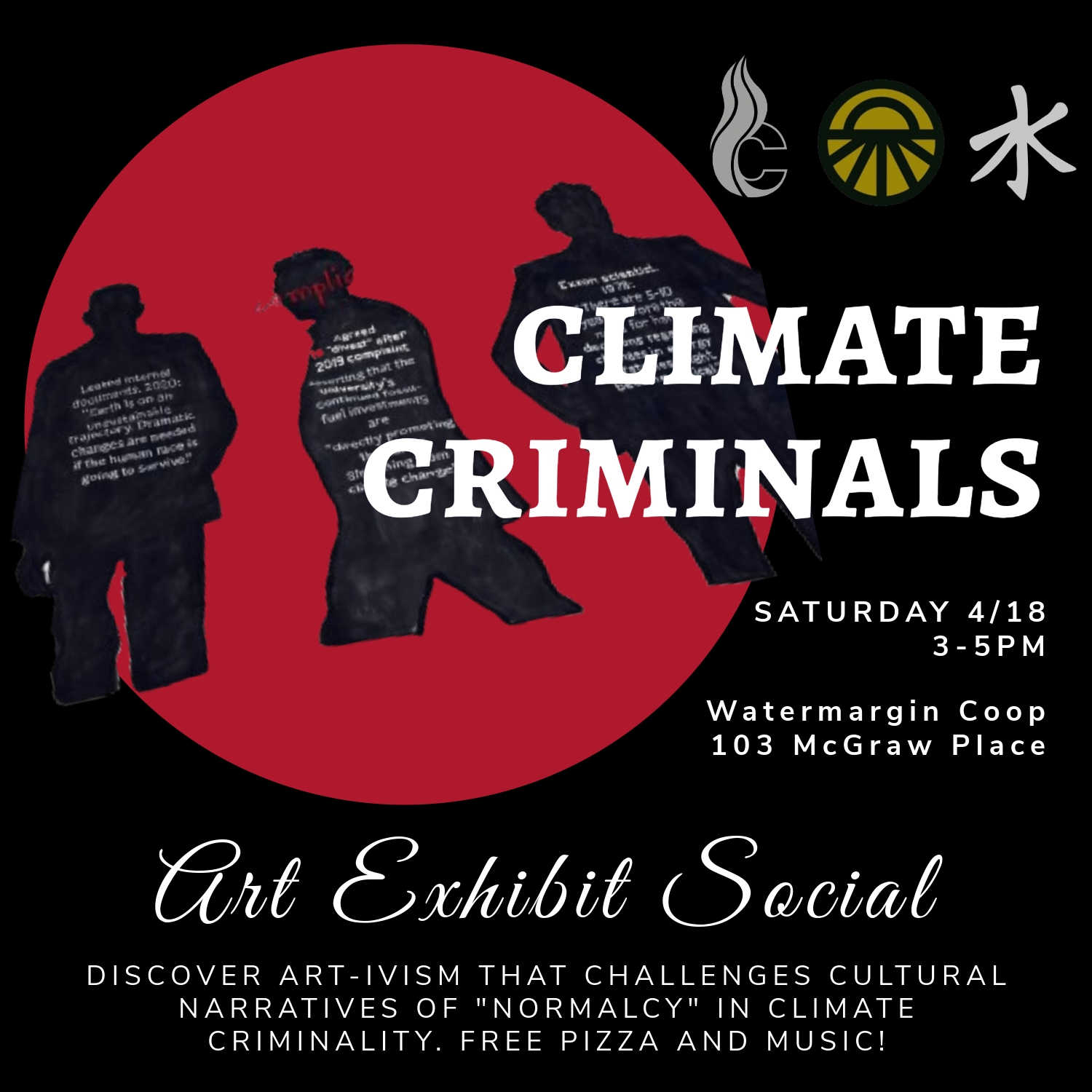Join us to experience a climate art-ivism display that challenges cultural creations of “normalcy” while the world burns. Artivism accompanied by free pizza and music. Drop by!
