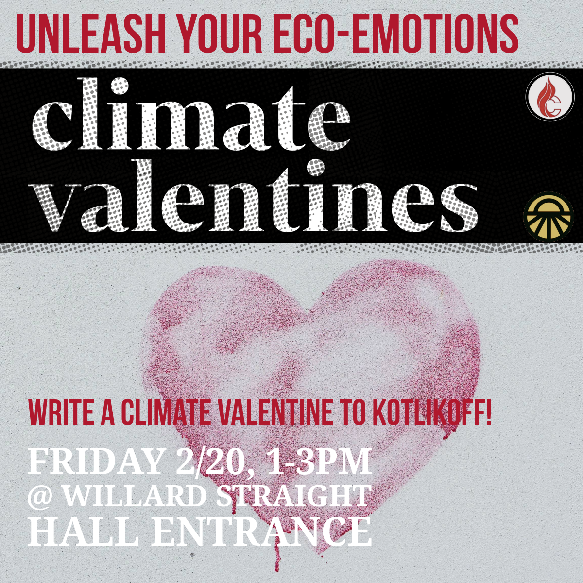 Drop by to make a climate valentine for President Kotlikoff! Show some love for earth and tell our university leadership they should too.
